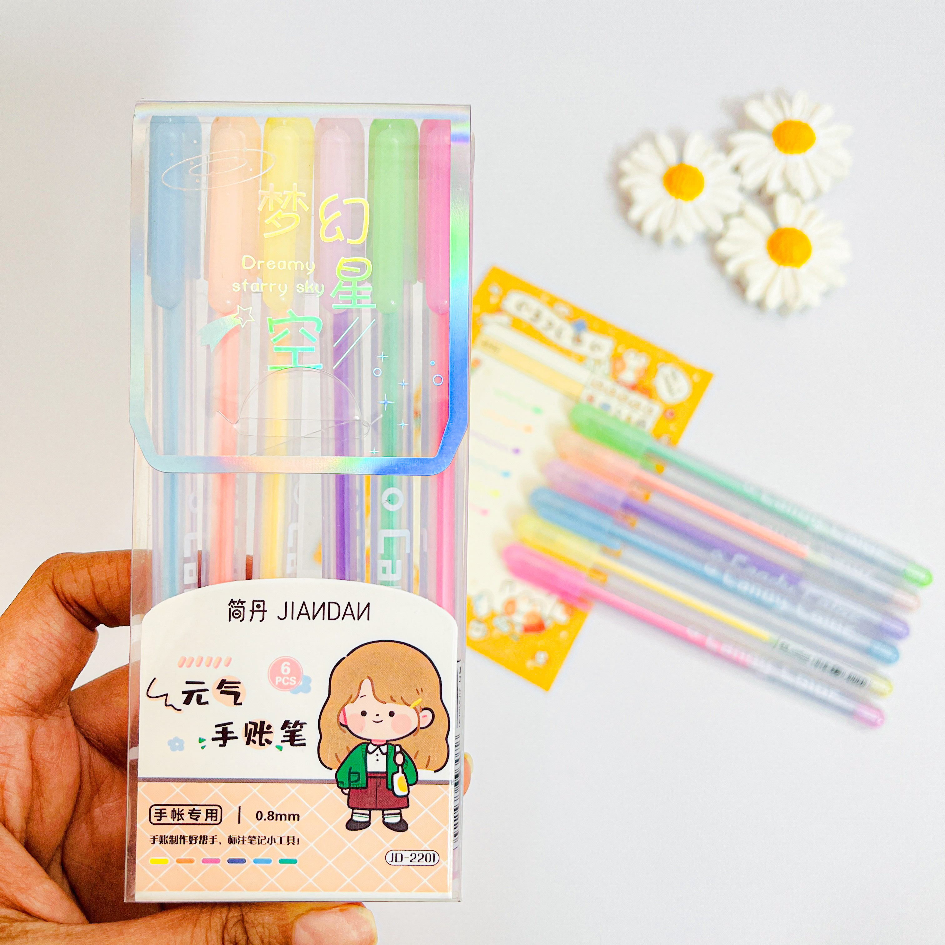 این ست شامل شش رنگ پاستلی شفاف و چشمنواز است که در طراحی، نتبرداری، هایلایت ظریف و نوشتن روزمره کاربرد دارد. جوهر روان و یکنواخت خودکارها تجربه نوشتنی نرم، بدون قطع شدن و بدون ریزش ایجاد میکند.